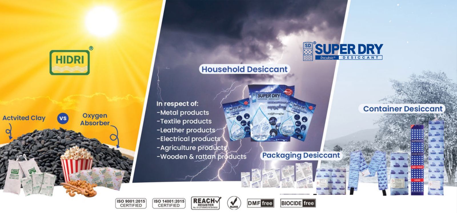 ကျွန်တော်များ Tint Sabei Trading Co., Ltd သည် ၂၀၁၂တွင် စတင်တည်ထောင်ခဲ့ပြီး container desiccant(ရေငွေ့ စုပ်ပစ္စည်း)အမျိုးအစား အမျိုးမျိုးကို ပြည်ပမှ အဓိက တင်သွင်းပြီး မြန်မာနိုင်ငံအတွင်း ဖြန့်ဖြူး ရောင်းချနေသော ကုမ္ပဏီဖြစ်ပါသည်။အထူးသဖြင့် Super Dry Container Desiccant အမျိုးမျိုးကို မြန်မာနိုင်ငံ အတွင်းတွင် Solely Authorized Distributor အနေဖြင့် ဖြန့် ဖြူး လျက်ရှိပါသည်။ Super Dry သည် Calcium Chloride Desiccant အမျိုးအစားဖြင့် ထုတ်လုပ်ထားပြီး ရေငွေ့ စုပ် ပစ္စည်း အမျိုးအစားတွင် အကောင်းဆုံးသော အမျိုးအစားဖြစ်ပါသည်။